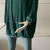 die Form ist körperumspielend in A-Linie (ausgestellt) und halblang. Weitere Details sind: seitliche Innentaschen, kleiner Seitlicher Gehschlitz, Rundhalsauscshnitt und langer Ärmel.
